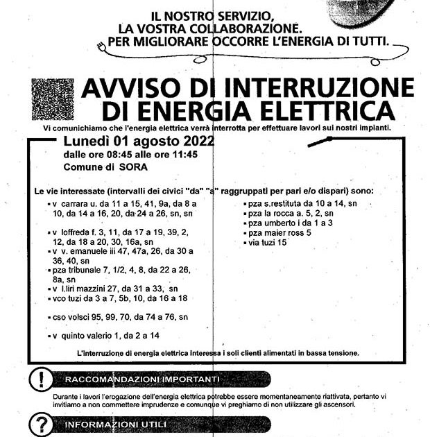 E-Distribuzione ha comunicato che lunedì 1° agosto 2022 si verificherà un’interruzione di energia elettrica, dalle ore 8.45 alle ore 11.45, in alcune zone della città di Sora.