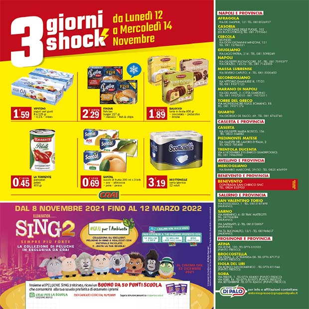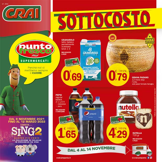 Vi ricordiamo, come sempre, di dare un’occhiata anche ai prezzi costantemente bassi sui prodotti a marchio CRAI, proposti grazie alla partnership con l’omonimo grande gruppo nazionale, e all’ultima pagina dedicata ai tre giorni shock, questa volta in programma dal 12 al 14 Novembre 2021! Di seguito le venti pagine del nuovo volantino.