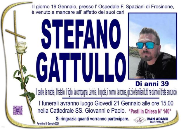 Le foto del profilo social con il suo primogenito, un maschietto. Un’altra figlia in arrivo che purtroppo non potrà conoscerlo. E poi la passione per il mare, le immersioni. Stefano Gattullo, appena 39 anni, era un uomo dedito al lavoro e alla famiglia. Si è sentito male alcuni giorni fa ed è spirato ieri all’Ospedale Spaziani di Frosinone.