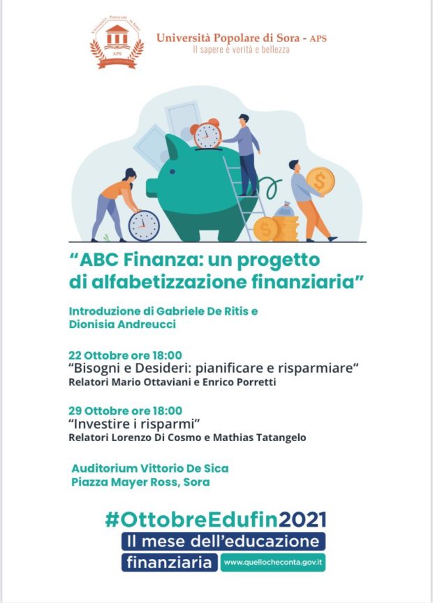 L’Università popolare di Sora aderisce al Mese dell’educazione finanziaria 2021, che ha per tema “Prenditi cura del tuo futuro!”, con due serate di studio e riflessione, che saranno introdotte dal professor Gabriele De Ritis, Presidente dell’Università popolare di Sora, e dalla dottoressa Dionisia Andreucci, Consulente finanziario: