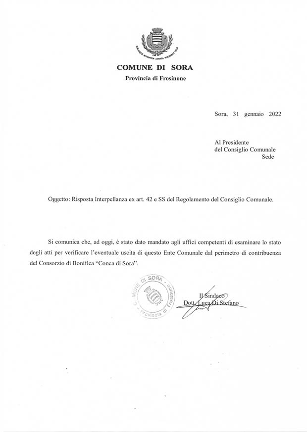 «Il 12 gennaio avevo presentato una formale interpellanza circa la – promessa – uscita della nostra Città dal perimetro di contribuenza del Consorzio di bonifica. Questa che pubblico è la risposta. Considero assolutamente insoddisfacente questa “laconica” risposta (ci sono voluti solo 20 giorni pensate!!!) che tradisce l’imbarazzo di fondo di questa amministrazione che cerca di tergiversare su una promessa fatta in campagna elettorale (vero e proprio cavallo di battaglia del Sindaco Di Stefano). Non chiarisce né quando né a chi è stato dato questo mandato.